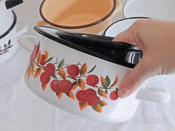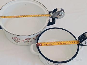 Vendo Set di pentole Smaltate Bianche con Fiori Decorati, delicate e Country, con un coperchio. Diametro dai 17 ai 23 cm 9 pentole e un coperchio!
