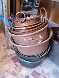 Set di pentole, tegami e scodelle in rame