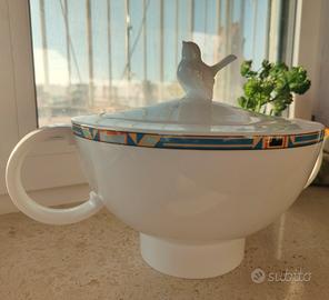 Tutti i pezzi sono decorati con un bordino a fantasia marinara con bandiere e il coperchio della zuppiera ha un manico a forma di uccellino.