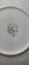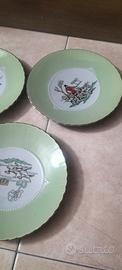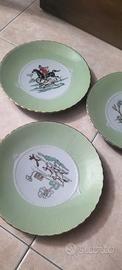 Set di 6 piatti+ piatto grande marchiate Galvani ceramiche. Sono in perfette condizioni, hanno motivi raffigurativi con bordi verde acqua con rifinitura dorata.
