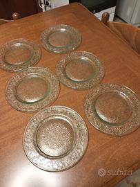Buongiorno, set di 6 piatti in vetro pressato verde vintage, probabilmente di Indiana glassa, ma non ve lo posso garantire, in quanto secondo i periodi li firmavano si e no. Comunque sono molto belli, come nuovi, li danno per insalata, ma possono andare molto bene per d'esser o altro. Hanno dei motivi decorativi in rilievo, misurano in diametro cm. 19, grazie per l'attenzione, e buone feste.