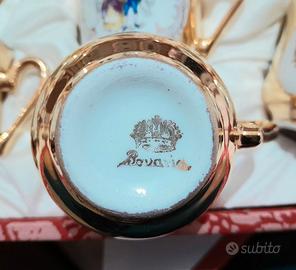 Collezione in porcellana, completa di confezione vellutata, di manifattura tedesca diBavaria, caratterizzata da decorazioni in oro zecchino e scene romantiche in stile Settecento.