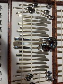 Vendo set di posate in acciaio inox e oro 18 carati sui bordi da 12 completo di tutto: forchette, cucchiai, coltelli, cucchiaini e forchettine da dolce, più un mestolo e 1 cucchiaio grande e 1 forchetta grande.