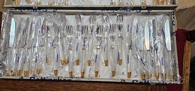 set da 72 pezzi Gottinghen formato da: coltelli, forchette, cucchiai, cucchiaini e altri accessori da cucina in acciaio inox e oro zecchino 24 karati. Mai utilizzato con tanto di pacco originale, etichetta e certificato di garanzia.
