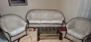 Set da salotto composto da un divano a tre posti e due poltrone in tessuto chiaro damascato con rifiniture in legno massello; un tavolino da caffè con piano in vetro, un carrello porta vivande con piani in vetro e tappeto in stile moderno.