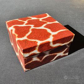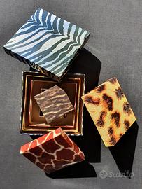 Set di quattro piccole scatole quadrate in cartone con fantasia livrea animale: zebra, ghepardo, giraffa, leopardo. Dimensioni dalla più grande alla più piccola : cm15x15x7,5 cm 13x13x7 cm 11x11x6 cm 7x7x5 Nuove! Spedizione gestita da Subito