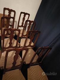 Set di otto sedie vintage in legno di noce intagliato e sedili intrecciati in paglia della prima metà del '900.