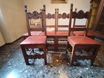 Vendo set di sedie d’epoca, fatte da artigiano, in noce massello, con intagli eseguiti a mano e seduta in vera pelle con borchie.