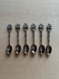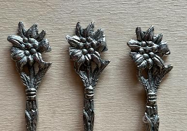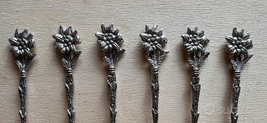 Set di sei cucchiani di peltro con stella alpina da collezionismo!! Sono perfetti e unici nel loro genere come potete vedere dalle foto con il disegno della stella alpina!! Sono particolari e difficili trovali sul mercato!! Cucchiaini rari da trovare sul mercato hanno una forma particolare unici!!