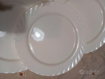 Sei piatti piani, bianchi, decorati finemente con motivo in rilievo sul bordo, diametro 32. In omaggio piatto per pizza dello stesso diametro.