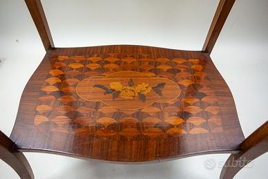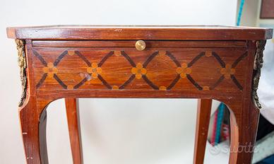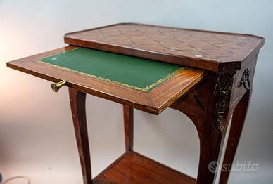 cassetto con maniglia e si distingue per il pratico sottopiano estraibile ricoperto in panno verde che lo rende adatto ad uso scrittoio. Il secondo, di forma simile, riporta intarsio con motivi floreali e a ventaglio, e si distingue per il piano mosso agli angoli le fasce e il cassetto bombato, elementi tipici del mobilio francese