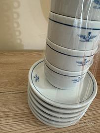 Set di 6 tazzine da caffè in porcellana bianca e blu con sei piattini, contrassegnati dallo stemma dell’Aeronautica Militare Italiana. Il design include l’aquila turrita, simbolo distintivo dei piloti militari italiani. Marca Tognana ottima qualità Nuovi