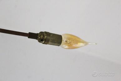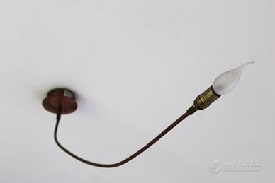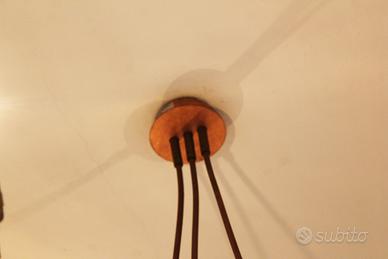 Set di tre lampade decorative da soffitto con supporto cilindrico color rame e stelo in tinta, ciascun punto luce è corredato da lampadina a fiamma in stile. Marca "Lucifero Illuminazione" modello "Aneis" 230W, max 3x60W. Due illuminazioni sono formate da una lampadina singola, mentre una si compone da tre lampadine orientabili nel supporto, con possibilità di distribuire la luce all’interno degli ambienti. Struttura priva di graffi o usura, ideale per salotto, corridoio, angolo lettura, camere da letto o sala da pranzo per caratterizzare alle stanze con gusto steampunk o vintage, da abbinare ad altri articoli ramati. Misure variabili.