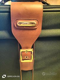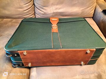 2 valigie Samsonite in tela, colore verde, chiusura con cerniera e cintura in cuoio e fibbia color oro.