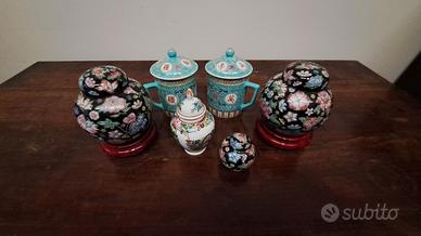 Questo è un magnifico set di vasi e tazze in porcellana finemente decorata, che aggiunge un tocco di eleganza e fascino orientale a qualsiasi ambiente. I pezzi sono dipinti a mano con vivaci motivi floreali e simboli tradizionali, e includono due vasi più grandi, due tazze con coperchio e due vasi più piccoli. L'insieme è perfetto per un collezionista o per chi desidera un'arredo dal gusto ricercato e esotico.