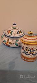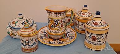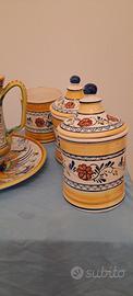Set di 7 pezzi vasi e piatto decorati