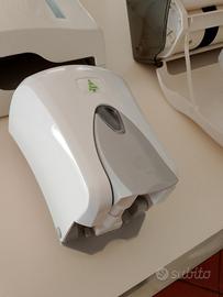 Set di accessori per il bagno commerciale o pubblico, marca DTM. Questi articoli sono progettati per l'installazione a parete in ambienti come hotel, ristoranti o uffici. Vendo separatamente a 25€ cadauno o tutti e tre insieme a 60€. Il set comprende tre componenti principali: Dispenser di asciugamani di carta (Superiore):Un distributore manuale a parete per asciugamani di carta piegati (come quelli a Z o C). Presenta una finestra verticale per monitorare il livello di riempimento. Dispenser di sapone (Centrale):Un erogatore a pressione per sapone liquido o gel igienizzante, con capacità 1 litro. Dispenser di asciugamani in rotolo (Inferiore):Un distributore "autocut" o manuale per rotoli di carta asciugamani continui, caratterizzato da un'ampia calotta bianca e istruzioni grafiche sulla parte anteriore per l'uso corretto.