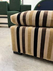 Set composto da un divanetto e due pouf, in tessuto a righe nei toni del beige, marrone e nero. I pouf sono dotati di cuscino removibile.