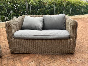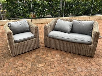 Vendo set divanetto + poltrona da esterno Maison du Monde. Come nuovo, usato pochissimo (1 sola stagione) . Cuscini in condizioni ottime. Misure divanetto: P85xL135xH70 cm Misure poltrona: P85xL80xH70 cm RITIRO SOLO A MANO. NON SPEDISCO.