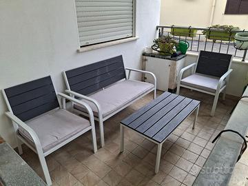 Divanetto da esterno posti a sedere 4 buone condizioni misure 110x50 due posti , 50x50 x altri due posti tavolo misure 97x47 materiale ferroso