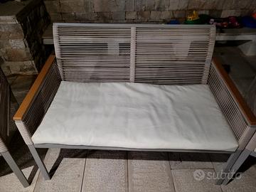 Vendo set completo da giardino composto da divanetto 2 posti, 2 poltrone e tavolino in metallo e vetro. Colore tortora, legno e cuscini panna sfoderabili