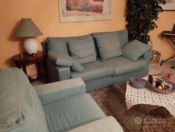 Set divano 3 posti e una poltrona di color azzurro e imbottiti di piuma. Dimensioni divano 1 x 2 m. dimensioni poltrona 1 x 0.91 m. Prezzo trattabile. Carica e trasporto a carico dell'acquirente.