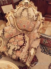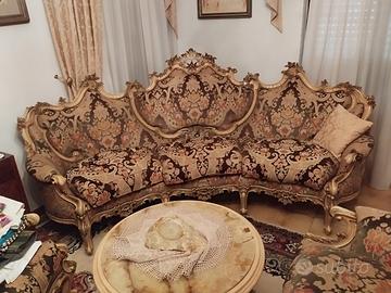 Vendo set completo di divano grande con 2 poltrone singole in stile barocco. Imbottitura in piuma d oca. Copertura sfoderabile e lavabile. Completa il tutto il tavolino stesso stile in marmo di Carrara. Per la spedizione posso noleggiare io un furgone e portarlo a destinazione oppure occuparvene voi.