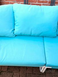 Elegante set da giardino con divano e tavolino coordinato, caratterizzato da cuscini imbottiti color turchese e struttura solida in metallo. Confortevole e moderno, perfetto per rilassarsi all’aperto. Ideale per terrazzi e giardini, dona stile e freschezza agli spazi esterni, creando un’accogliente area living per ogni occasione. È sfoderabile. Grazie