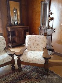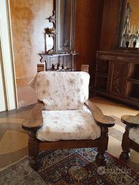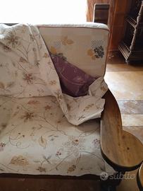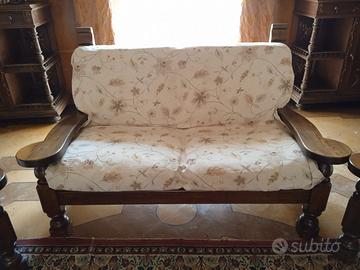 Set composto da 1 divano a 2 posti e 2 poltrone in legno massello. In perfette condizioni. Misure: