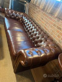 Vendo set composto da divano Chesterfield di pelle vera, poltrona coordinata e due tavoli in legno.