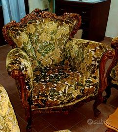 il set Barocco è composto: 1 divano 3posti 2 poltrone con bracciolo 1 tavolino Colore verde e giallo floreale, in ottimo stato.