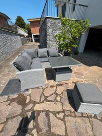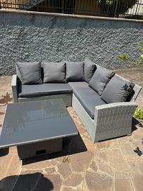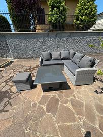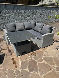 Divano a due pezzi a L con tutti cuscini sfoderabili e lavabili. Tavolino basso con meccanismo per alzarlo Sgabello con cuscino sfoderabile Non accetto permute