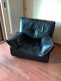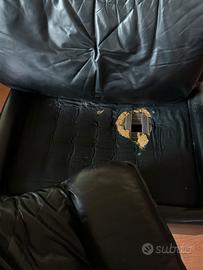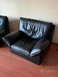 Set divano e due grandi poltrone in vera pelle nera. divano 180x90 h80 / poltrone 100x90 h80 La pelle è ben conservata e ancora morbida, ma tutti i pezzi presentano segni d'usura dovuti al tempo nella parte sottostante la seduta (visibili da foto).