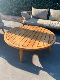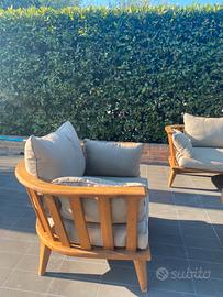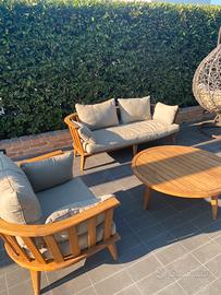 Vendo set da outdoor composto da divano,poltrona e tavolino, in legno con cuschini come da foto 175 cm x 74cm divano 95 x 74cm poltrona 50 cm diametro tavoino