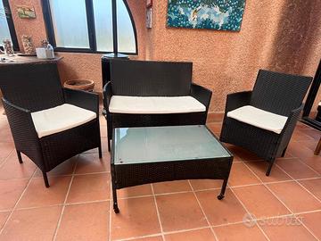 Set da esterno in rattan composto da divano, 2 poltrone e tavolino, inclusi cuscini. Buone condizioni