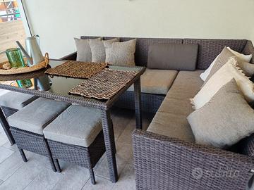 Come da titolo, vendo set per terrazzo/giardino formato da divanetto angolare, tavolino con top in vetro nero, 3 sgabelli e cuscini.