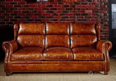 Divano vintage fabbricato in pelle naturale, realizzato su misura in stile retrò.