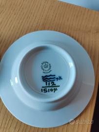 Il marchio con la corona è le tre linee ondulate (fotografato) è il simbolo di Royal Copenhagen un'azienda danese fondata nel 1775 nota per le sue porcellane di qualità. I numeri scritti a mano 112 e 15104 visibili sempre sul fondo dei piattini indicano il numero del modello e il decoratore che lo ha dipinto.