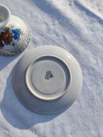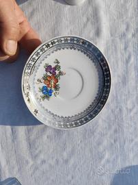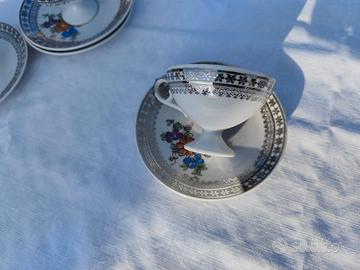 Elegante set di due tazzine da caffè in porcellana Bavaria. Il design presenta un raffinato bordo argentato e decorazioni floreali colorate. - Due tazzine da caffè. - Piattini abbinati inclusi. - Dettagli floreali vivaci. - Bordo decorato con motivo argentato.
