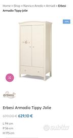 Set Erbesi Tippy Jolie avorio, composto da armadio L 94 cm P 56 cm H 175 cm (prezzo 350) e Bagnetto Fasciatoio: composto da sola cassettiera con 3 cassetti e vaschetta laterale porta oggetti, dotata di 4 ruote piroettanti (prezzo 180) più un regalo a scelta. Vendita in blocco 500 euro. Tenuti in ottime condizioni. Visibili a Sava TA. Per info tel al 3204852207