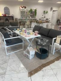 Set in Ferro bianco, composto da divano tre posti con due poltrone e Tavolo. L’altezza del tavolo permette di essere utilizzato anche come tavolo da pranzo esterno.