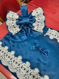 Set coordinato per la cucina,composto da copri forno forma di fiocco e copri fornelli lineare.Bordi in pizzo rebrode’ tessuto rasattello blu. In omaggio come ce scritto nella foto due presine cuore
