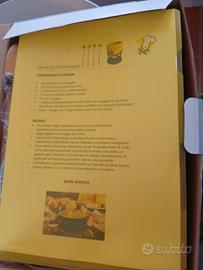 Bellissimo set per fonduta con caquelon in ceramica decorata, supporto in legno porta bruciatore a forma di slitta e 6 forchette in acciaio con manico in legno