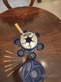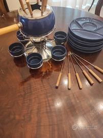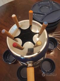 Vendo splendido set completo da fonduta (Bourguignonne, Formaggio o Cioccolato), mai utilizzato e in condizioni impeccabili. Il design è elegante e intramontabile, con un raffinato contrasto tra il blu scuro smaltato e le finiture in legno naturale.