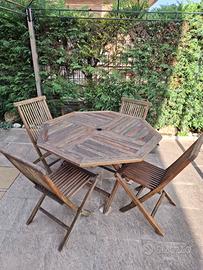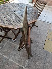 Set giardino Tavolo in legno Teak forma esagonale e 4 sedie, tenuto abbastanza bene appena fatto trattamento con prodotto protettivo