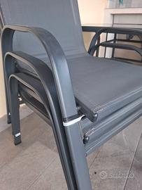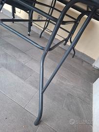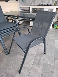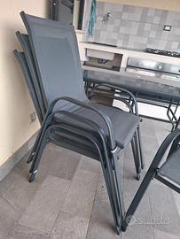 ## **Set Giardino: Tavolo in Vetro Temprato + 4 Sedie Impilabili** Vendo bellissimo set da esterno, ideale per balcone, terrazzo o giardino. Il set è composto da un tavolo spazioso e 4 sedie coordinate. ### **Dettagli del prodotto:** * **Tavolo:** Struttura in metallo grigio scuro con elegante piano in **vetro temprato** nero. Molto robusto e facile da pulire. * **Sedie:** 4 sedie impilabili in metallo e tessuto tecnico (textilene) grigio, traspirante e resistente alle intemperie. * **Stato:** Il set è in buonissime condizioni generali, acquistayo lanno scorso . **Nota bene:** una sedia presenta una rottura sulla struttura (come mostrato in foto), ma è facilmente riparabile o utilizzabile come ricambio. ### **Prezzi:** * **Tavolo:** 50 € * **Sedie:** 15 € l'una * **Totale Set:** 95 € (la sedia danneggiata è **in omaggio** se si acquista il set completo). **Informazioni aggiuntive:** * **Ritiro:** A carico dell’acquirente (zona [Inserisci la tua città/quartiere]). * **Salvaspazio:** Le sedie sono impilabili, perfette per essere riposte durante l'inverno occupando pochissimo spazio