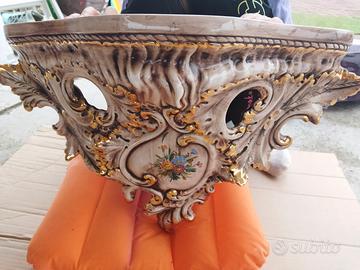 Set in ceramica dipinto a mano Antica Bassano in perfette condizioni con garanzia. Composto da specchio, consolle da appendere, termometro e candelabro.
