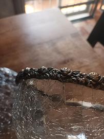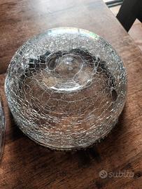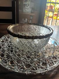 2) scodella in cristallo con bordo argentato vintage, molto pesante. Diametro cm. 18. Presenta una piccola e quasi invisibile incrinatura che è comunque ininfluente per la stabilità dell'oggetto ( vedi ultima foto).