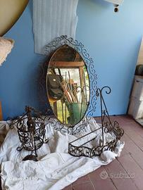 Set in ferro battuto comprensivo di specchio, lampadario e mensola. Adatto per arredare un ingresso o bagno in casa rustica. Specchio molto bello.
