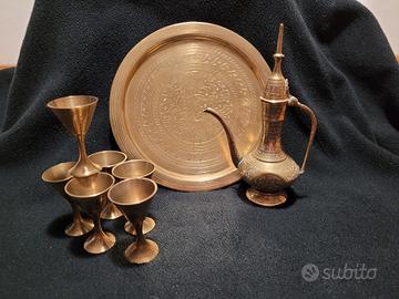 set in ottone tazze, teiera e vassoio di manifattura araba
